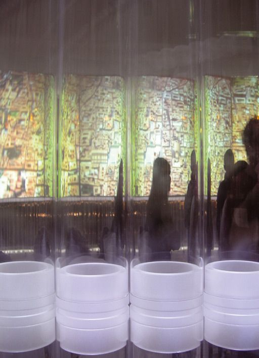 réalisé en cent jours seulement, le pavillon d'exposition a été conçu comme une superposition de deux parties : une partie au niveau de la route de 200 m2 et une seconde partie souterraine de 800 m2. les 'gouttes' sont la partie émergée et représentent l'entrée de l'espace et la réception. 542 cannes en plexiglass éclairées séparément avec 3000 LED blanches et bleues sont la lumière des gouttes : un logiciel sophistiqué spécialement conçu pour le projet est programmé pour allumer et contrôler de manière alternée les lumières, dans une série infinie de combinaisons possibles.