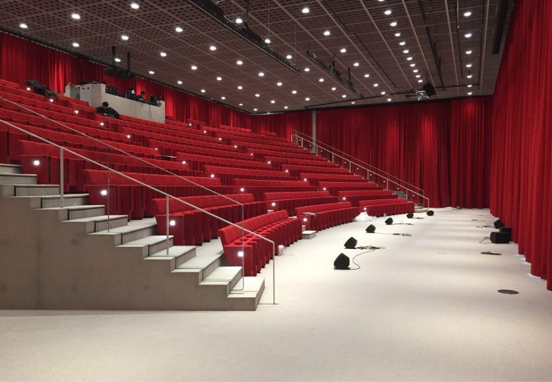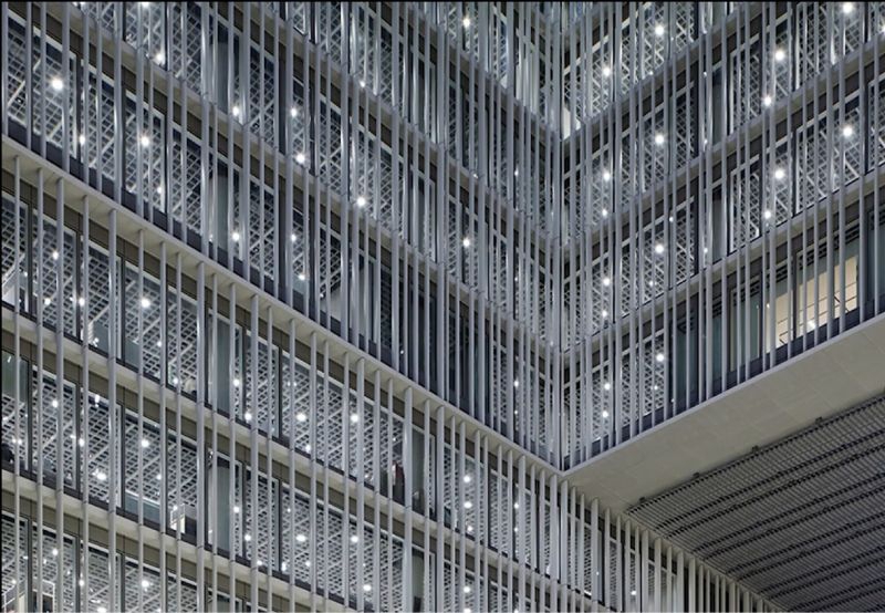 le bâtiment se présente d’ailleurs comme une composition d’espaces avec des fonctions très diverses entre elles : musée, auditorium, bureaux, zones de vente. c’est ainsi qu’est né le concept d’une famille de lampes flexibles aux fonctions diverses, qui offrent une excellente qualité de lumière avec des coûts énergétiques réduits, et surtout avec des frais d’entretien presque nuls. le projet technique d’éclairage du cabinet arup explore le rapport entre la lumière naturelle et artificielle : l’éclairage de Viabizzuno exprime donc qualité et excellent rendu des couleurs pour le bien-être de toutes les personnes qui travaillent à l’intérieur du site. la lumière entre dans les espaces à travers des grandes baies vitrées de la façade, où une série d’éléments verticaux en aluminium permettent un contrôle ciblé, évitant tout effet d’éblouissement. viabizzuno a travaillé en collaboration avec les deux cabinets berlinois pour concevoir une lumière qui s’approche le plus