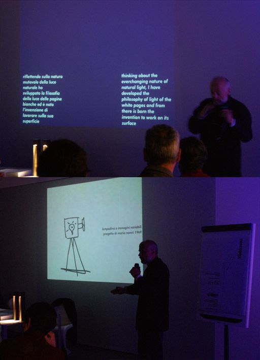 mario nanni, ha raccontato poi gli ultimi lavori realizzati con la liv, lampadina ad immagini variabili: dalla luce dinamica che ha illuminato l'arco di augusto di rimini, allo spettacolo di luce e voce realizzato per illuminare la piazza e il monumento di baracca a lugo di romagna per lugocontemporanea08.