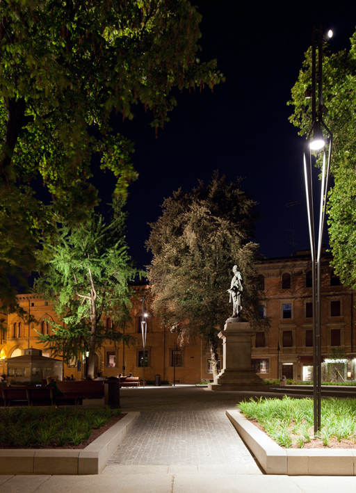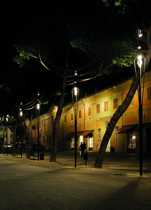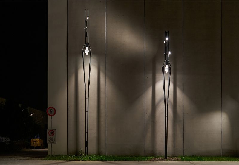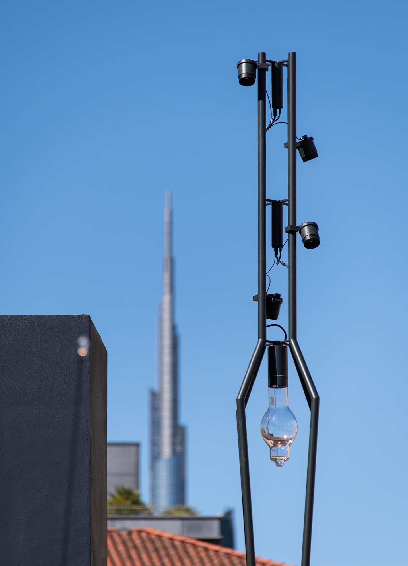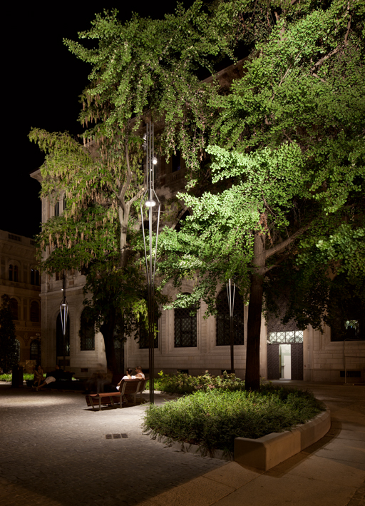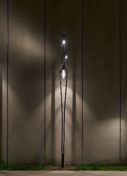 sistema di illuminazione per esterni IP55. modelli: lucus 01, h.9000 fuori terra lucus 02, h.7768mm fuori terra, costituiti da quattro tubolari in acciaio inox AISI 304 di diametro Ø48mm che a circa 3/4 della propria altezza si divaricano per accogliere un apparecchio di illuminazione per poi richiudersi e diventare supporto per spot d'accento. due alimentatori dali inclusi che possono alimentare fino a 4 nett uno. componenti: nett uno 100, cablato con sorgente elettronica 2700K o 3000K fino a 30,4W 4577lm ottiche 8° 18° 25° 37° 58° aggancio Ø48mm, alimentatore escluso; kit bilbo g per luce diretta diametro Ø262mm h.367mm, cablato con sorgente elettronica 3000K 38,4W 4250lm, ottica 40° alimentatore 240V 50-60Hz incluso. kit lanterna massima per luce diffusa con ampolla in vetro soffiato extrachiaro, diametro Ø224mm h.726mm, cablato con sorgente elettronica 3000K 38,4W 4250lm, alimentatore 240V 50-60Hz incluso. l'alimentatore prevede diverse modalità di collegamento e relativa programmazione per gestire la dimmerazione dell'intensità. accessori: chiave a nastro per serraggio vetro e morsetto per fissaggio componenti esterni. finiture: bruno antico, nero notte, scurodivals, grigio argento.