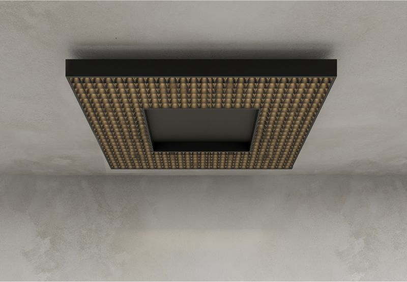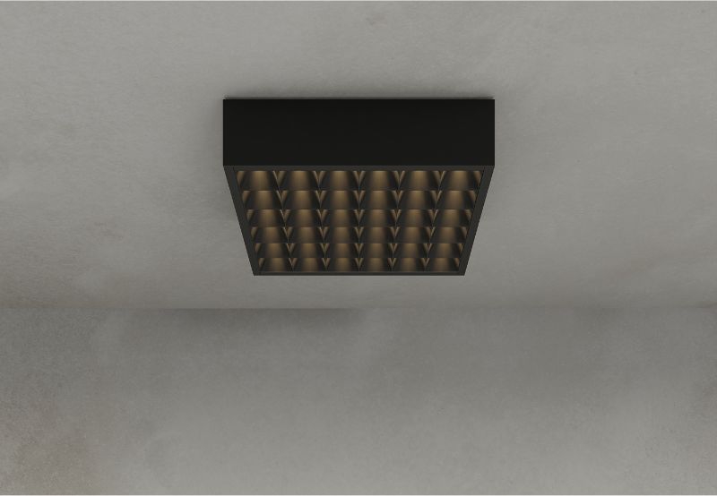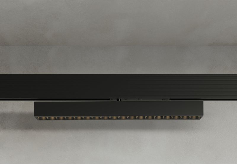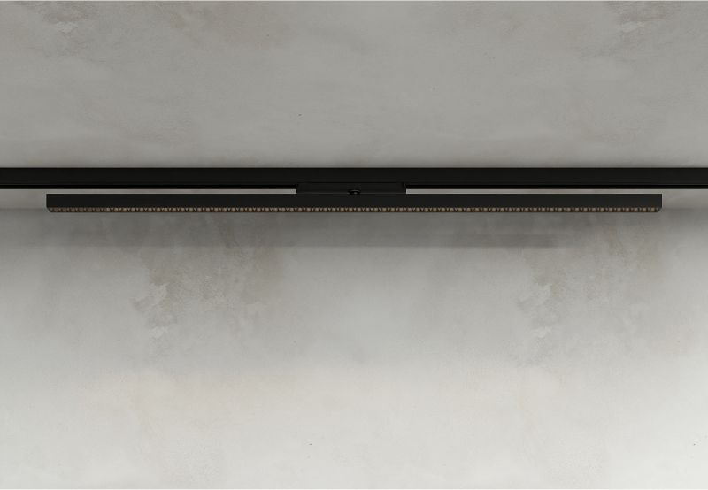 sistema di illuminazione per interni IP40 a luce diretta realizzato con corpo in alluminio verniciato e trappola di luce nero opaco.