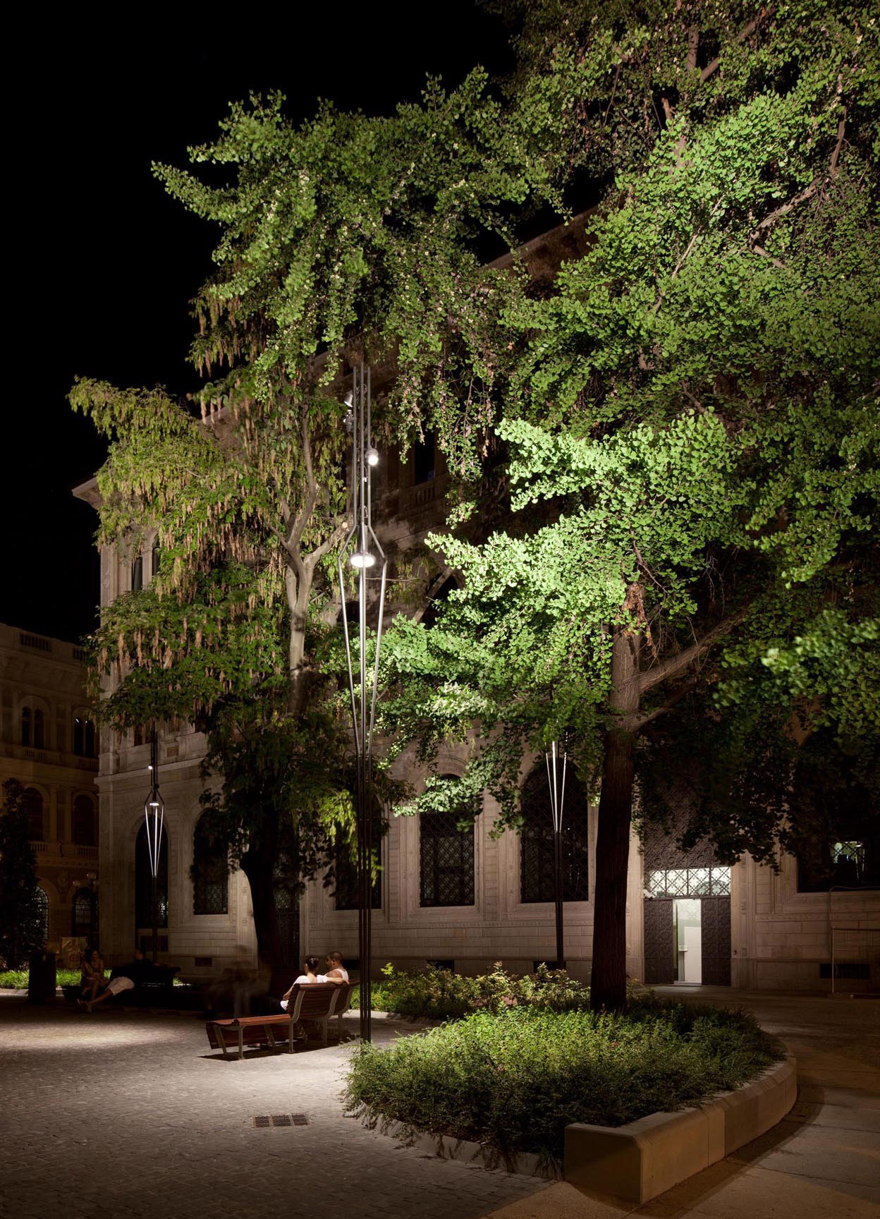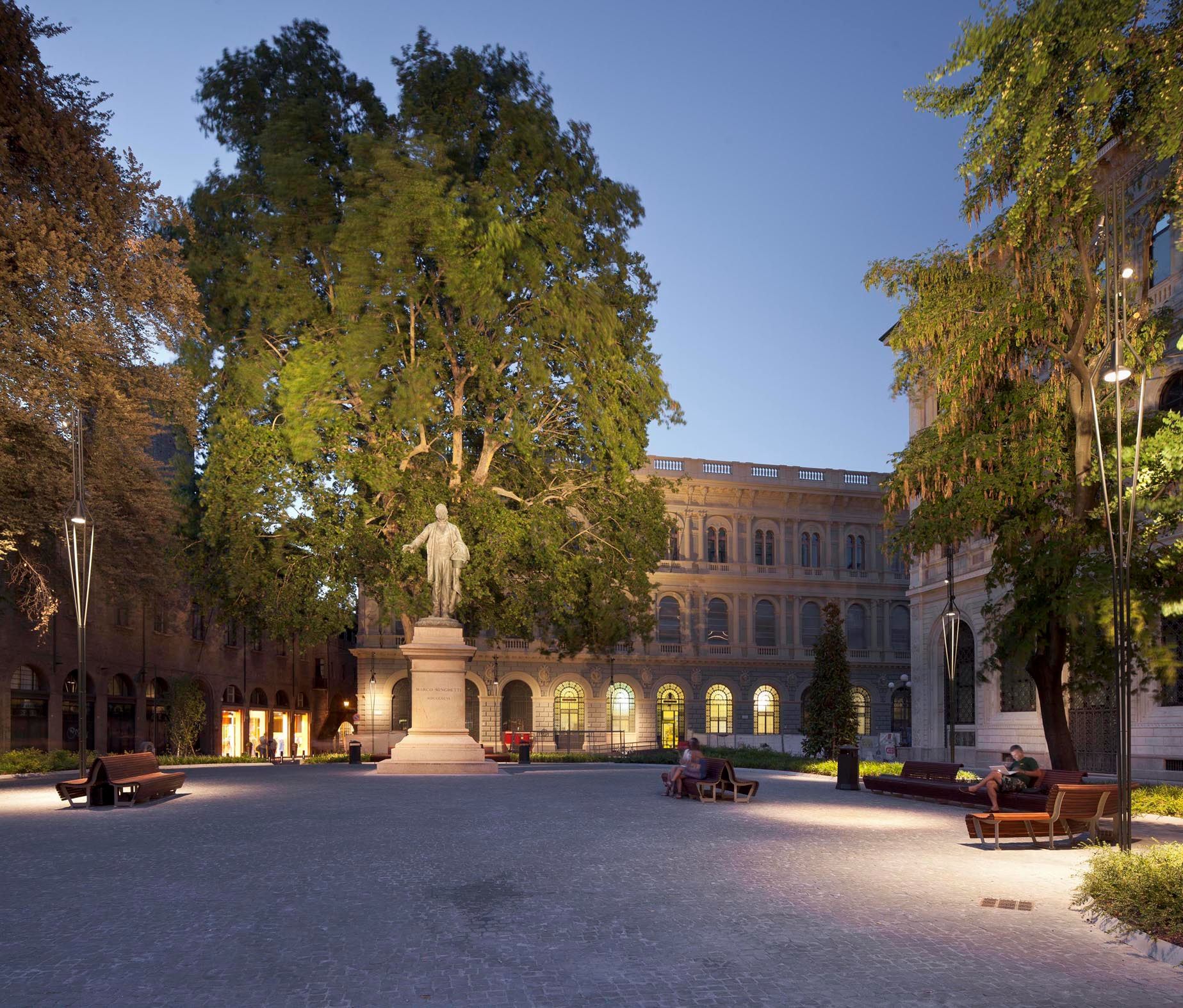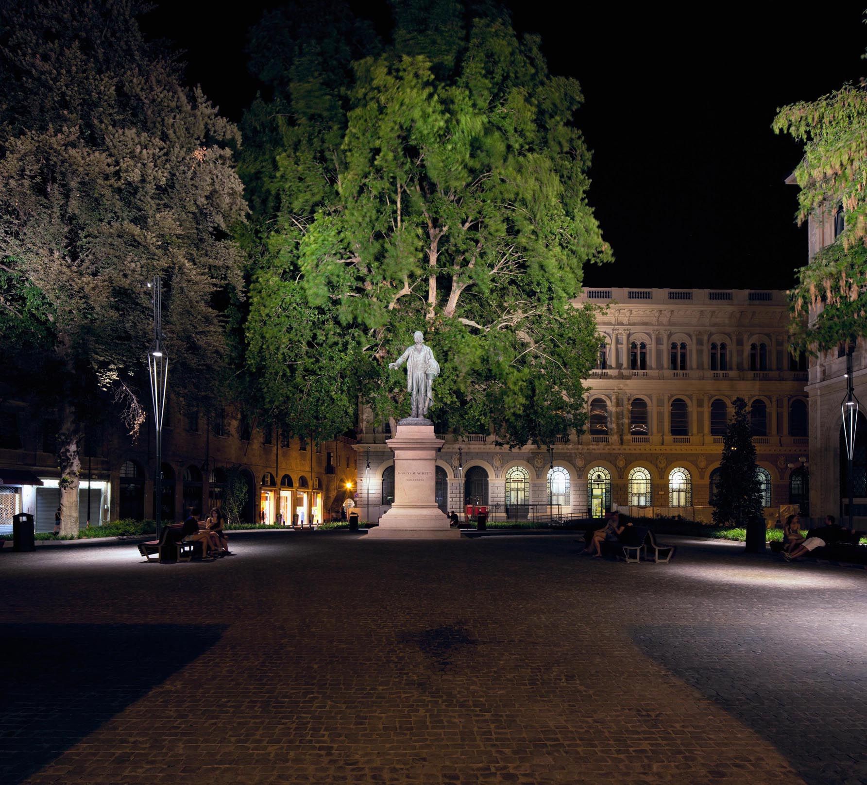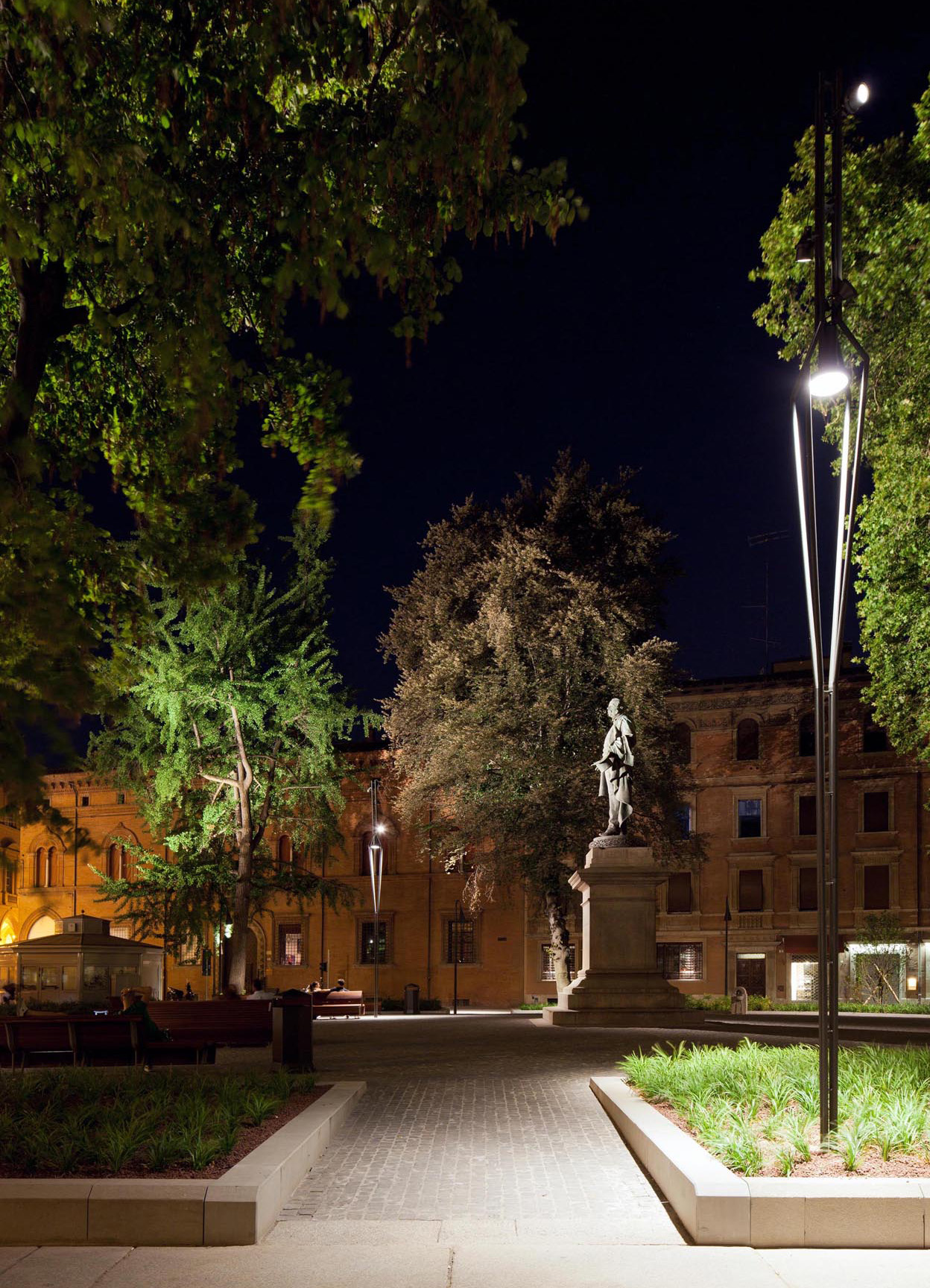 di mogano che, mutuando gli andamenti curvilinei concavi dell’isola, costituiscono le ali di una ‘assemblea urbana’, ove la calibrata distanza prossemica realizza contemporaneamente il principio della ‘presenza degli altri’ e della ‘libertà di comportamento’. il monumento centrale di marco minghetti, politico italiano di origini bolognese di fine ottocento, sorge ora direttamente dalla pavimentazione, perdendo così l’impostazione iconica estranea per diventare una presenza domestica di relazione quasi personale. una qualità speciale è data dalla forza emozionale dell’illuminazione nella versione progettuale di mario nanni che compone una sinfonia luminosa poetica e rispettosa del consumo energetico al tempo stesso. per rispettare e valorizzare la diversità degli elementi che caratterizzano quest’area, si è infatti scelto di integrare passato e presente, nuove tecnologie e vecchi corpi illuminanti, progetto contemporaneo e tradizione, dando vita ad una progettazione che ha come matrice il restauro conservativo della luce. il progetto della luce per piazza minghetti è partito da questi principi: