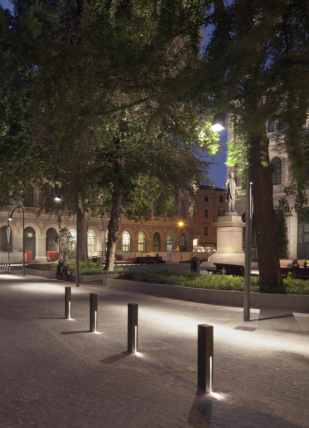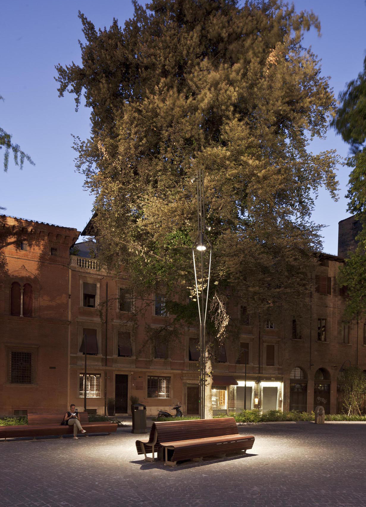 la città di bologna riconquista una delle sue storiche piazze grazie ad un intervento architettonico e urbano coniugato dal progetto della luce che ha avuto come obiettivo quello di restituire ad un grande vuoto urbano, dalle funzioni multiple e confuse, la sua originaria identità di giardino come spazio di sosta e di contemplazione. grazie al progetto dell’architetto glauco gresleri i 4.500 mq della piazza ‘giardino’ sono tornati al loro ruolo di luogo di passeggio, incontro e di abbellimento della città, orgogliosa dei suoi nuovi centri direzionali e della sua contemporaneità, senza dimenticare tuttavia i segni di un passato più antico. il progetto ha previsto infatti di evocare la presenza dell’aposa, l’antico torrente bolognese che fino alla fine dell’800 correva ancora a cielo aperto, dei preesistenti monumenti religiosi, e anche di utilizzare le antiche misure bolognesi. il progetto si inserisce all’interno di un contesto urbano storicamente ed architettonicamente rilevante per la città di bologna in cui sono stati individuati diversi elementi fondamentali ognuno con una propria identità: via de toschi, il giardino, il palazzo delle poste, la cassa di risparmio e piazza del francia. una piazza, nuova, dove il sostare, durante il passaggio, o in relax sulle panchine disposte a grande enclave, diventa occasione per scoprire i fronti architettonici dei palazzi del mengoni, delle poste e zambeccari, nonché delle case di via de’ toschi, ora ben visibili anche da via farini, grazie alla trasparenza delle pensiline autobus che conferiscono al sito una profondità prospettica prima sconosciuta. i pali ‘sentiero di vals’ ci guidano passo dopo passo alla zona relax ben distinguibile grazie alle lunghe panche di legno