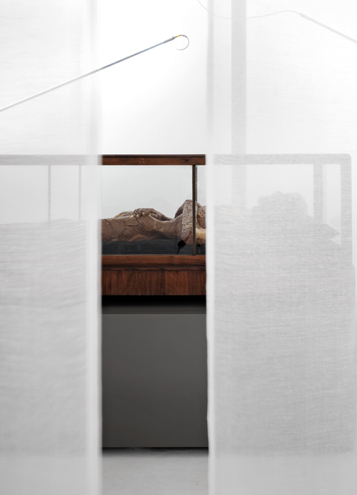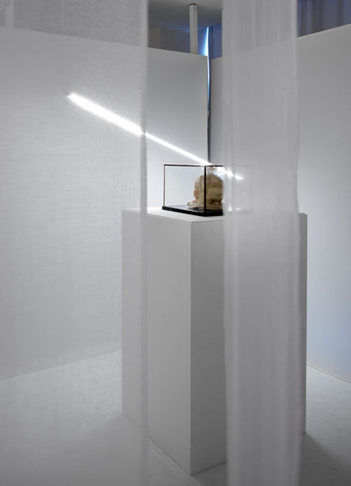 in uno spazio rarefatto, un uso efficace ma discreto delle tecnologie d’avanguardia e delle sorgenti luminose attentamente progettate da mario nanni, consente il disvelamento progressivo dell’umanità delle cere grazie ad un susseguirsi di quinte e filtri visivi e sensoriali.