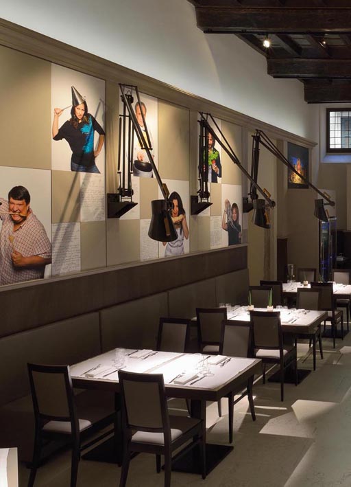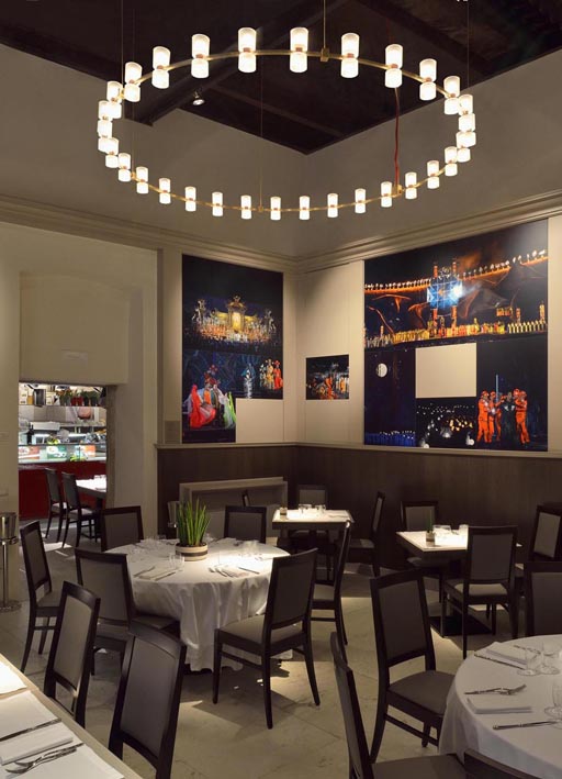 nell’ottobre 2013 nasce a verona amo opera restaurant, ristorante di amo, arena museo opera, museo dell’opera della fondazione arena attivo nell’esposizione di materiali d’archivio, nella produzione di mostre e di percorsi didattici collaterali al cartellone artistico del festival lirico all’arena e al teatro filarmonico. il museo amo, e lo stesso ristorante, occupano gli articolati spazi, densi di storia veronese, costituiti dal compendio di palazzo forti, di proprietà di fondazione cariverona, già utilizzati in passato come sede della galleria di arte moderna. da alcuni decenni gli spazi rappresentano, per la città e per i suoi visitatori, un polo di interesse culturale che offre molteplici occasioni di conoscenza e dibattito all’interno del variopinto universo artistico. da quando, nel 2012, il museo dell’opera amo è stato allestito negli spazi di palazzo forti, sono la musica d’opera e il suo humus artistico a contaminare, insieme all’arena, sia lo storico complesso di edifici che il dna cittadino. fondazione arena ha ritenuto necessario dotare il museo di un ristorante di profilo adeguato sia al contesto architettonico che al pubblico dei visitatori il cui palato risulta essere particolarmente raffinato, soprattutto in campo musicale. il concept è stato basato quindi sul conseguimento di due obiettivi principali: 1. adattamento del design dei componenti di arredo al contesto storico utilizzando un linguaggio di mediazione che, ispirandosi alla tradizione dei locali della ristorazione elegante, traesse spunti compositivi e cromatici dalla contemporaneità. 2. alto livello di prestazioni di confort ambientale e funzionalità operativa con particolare attenzione all’offerta di una ristorazione moderna e fortemente caratterizzata dalla presenza di un museo della lirica. nel primo caso il progetto, tenendo conto delle caratteristiche degli spazi costituiti da locali di elevata altezza e pareti e soffitti dai caratteri storici consolidati, ha introdotto dei rivestimenti alle pareti in legno sia scuro che laccato, in parte riccamente modanati, i quali, mediando con la loro proporzione le altezze dei locali, sono stati utilizzati per esporre pannellature fotografiche che rappresentano sia scene di allestimenti di opere areniane sia una serie di cantanti, interpreti vocali delle opere, ripresi alla prova dei ‘fornelli’. le stesse pannellature hanno rivestito, interpretando con l’uso del vetro retroverniciato in colore rosso carminio la funzione moderna della ristorazione, le attrezzature destinate alle funzioni del bar e del bancone gastronomico. l’impianto distributivo dei circa sessanta posti a sedere - sedute singole o a panca - ricorda volutamente la tipologia dei bistrot parigini, senza tralasciare il carattere degli spazi che consentono sia una forte socializzazione tra i visitatori, sia, nel caso, una forte riservatezza degli stessi, grazie a una sala privata. nel secondo caso il livello prestazionale è stato garantito da una particolare attenzione all’impiantistica intesa sia come climatizzazione che come spazi destinati a servizi igienici e alle attività di produzione gastronomica. sulla base di queste premesse, la scelta dei corpi illuminanti Viabizzuno ha consentito di centrare entrambi gli obiettivi del concept e in particolare: 1. armonia con gli spazi densi di spunti storico architettonici 2. particolare attenzione alle forme dei corpi illuminanti, capaci di integrarsi nello spazio, ma al tempo stesso di diventare esse stesse forme di narrazione e compartecipazione. la anselmo parete ritma la parete adiacente i tavolini di fronte al banco bistrot, dando la possibilità all’utente di posizionare la sua luce dove desidera; il royal chandelier, invece, aumenta la magnificenza dei saloni storici. 3. efficienza di illuminamento costituita da fonti differenziate sia ad incandescenza che a led. la composizione delle varie tipologie di apparecchiature e la loro fusione ha inoltre consentito un effetto finale che valorizza gli spazi, gli arredi, le decorazioni e soprattutto che produce un’atmosfera particolarmente emozionale fatta di luci, penombre e ombre che coinvolge l’ospite in un’esperienza ricca ed elegantemente variegata; in una parola: musicale.