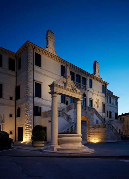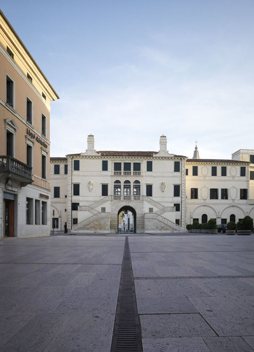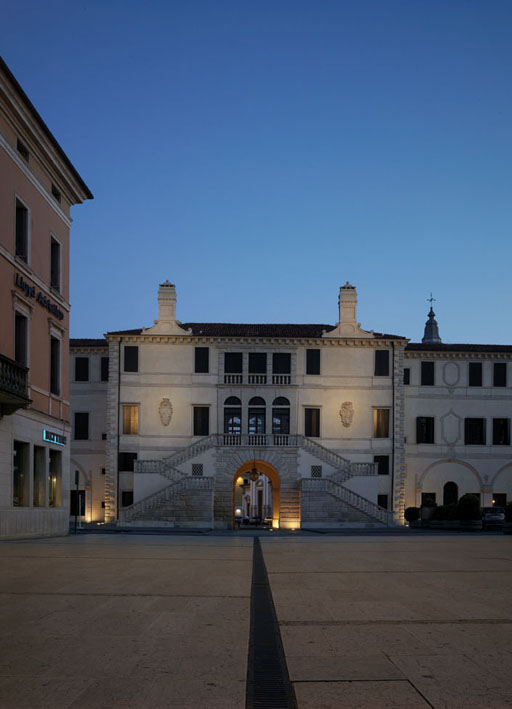 palazzo pisani prende il nome dalla nobile famiglia veneziana che nel sec. XVI ha costruito e poi posseduto ininterrottamente per tre secoli l'edificio, oggi sede municipale della città di lonigo (vicenza). l'immagine più antica che ci è pervenuta del palazzo è la mappa rosa del 1597 che ‘fotografa' in primo piano l'impianto originario dell'edificio posto a presidio della porta a mezzogiorno tra le due torri merlate e il bel pozzo rinascimentale. solo sul finire del ‘600 questo impianto si modifica radicalmente: il palazzo ingloba le torri di guardia con l'aggiunta di due ali poste ai lati est ed ovest, mentre il prospetto nord è abbellito con l'aggiunta della scalea esterna di accesso al piano nobile. nasce così il ruolo urbano e architettonico di questo edificio, che se da un lato funge da cerniera tra il nucleo medioevale del borgo cittadino e la più recente espansione ottocentesca, dall'altro si pone come scorcio prospettico per la piazza antistante. il progetto di restauro delle facciate del palazzo pisani parte dalla lettura di questa valenza scenografica dell'edificio e fa ricorso all'uso della luce per valorizzare le singole facciate in modo differenziato in ragione dell'articolazione dei volumi, degli spazi antistanti, della loro funzione. il progetto illuminotecnico è stato realizzato partendo dalla sottolineatura della plasticità dei volumi. la forza espressiva delle masse emerge grazie a fasci di luce radente sulle superfici di scorcio. il risultato d'insieme è arricchito dalla caratterizzazione di alcuni elementi architettonici di pregio quali: il pozzo cinquecentesco, gli stemmi sulla facciata nord, i camini sul tetto. la luce che si appoggia su questi elementi aiuta anche lo spettatore più distratto ad apprezzarli e a conoscerli.