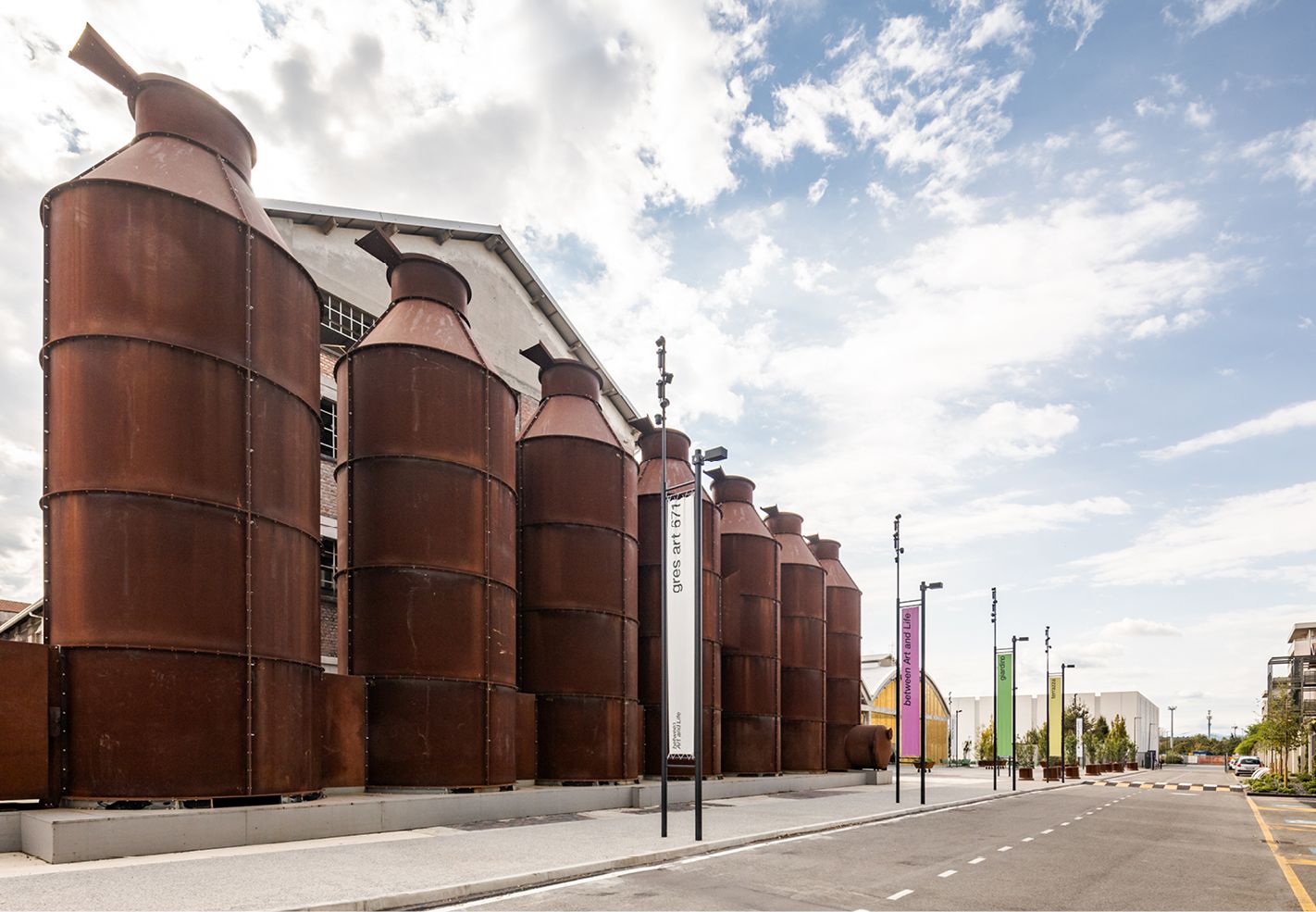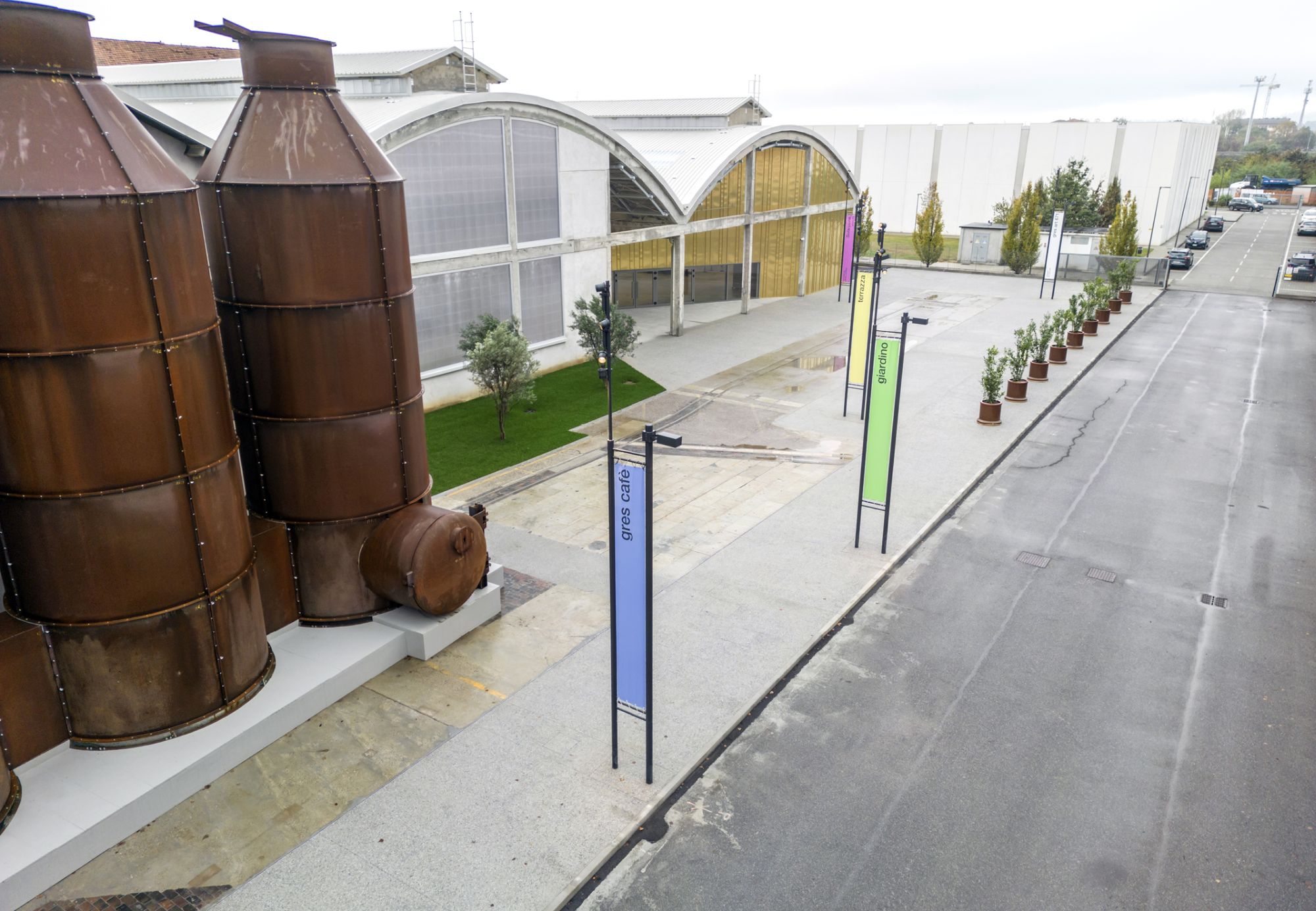 conduce all’edificio una solenne promenade, scandita da pali gonfalone alti 8 metri con proiettori