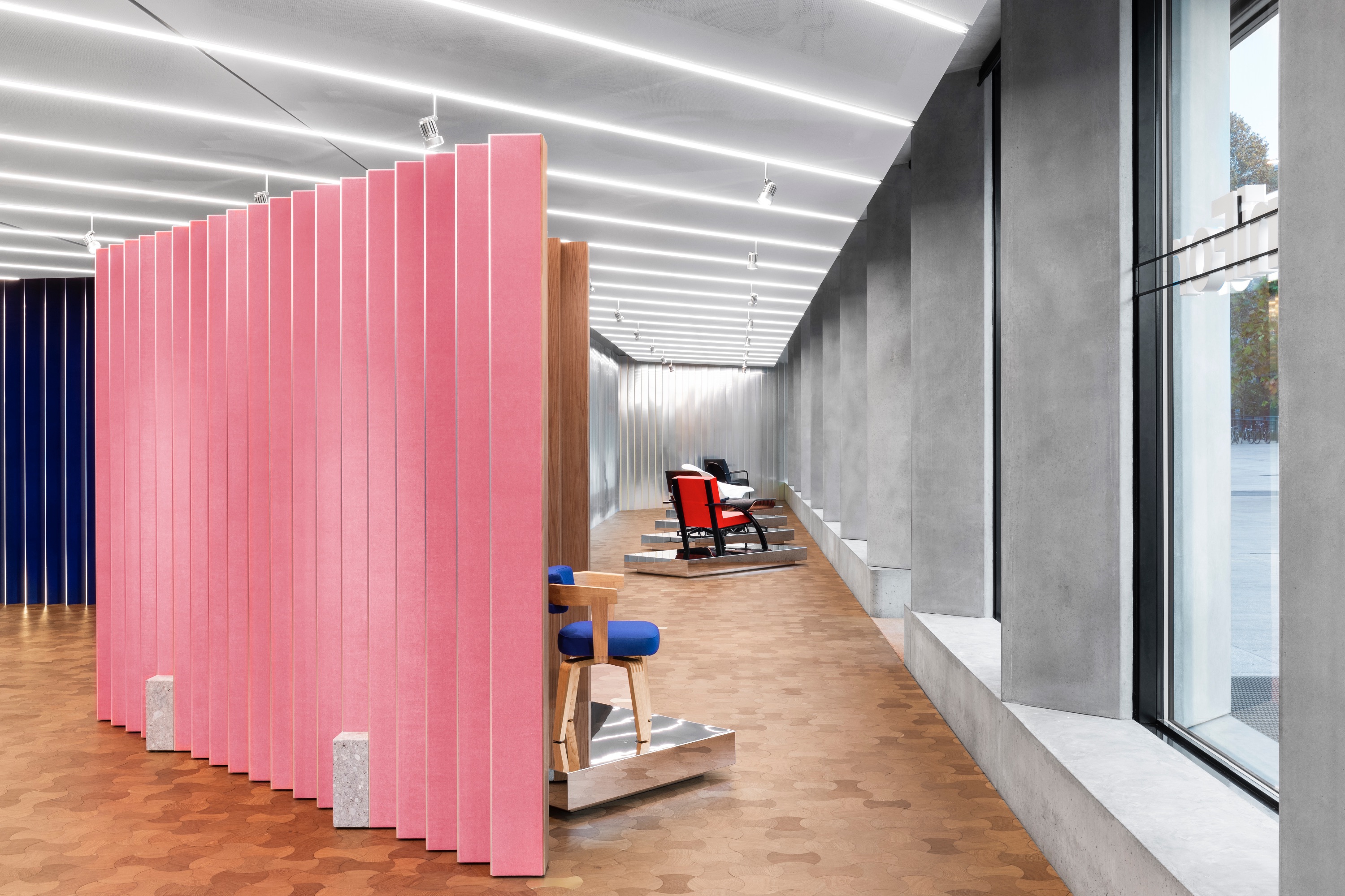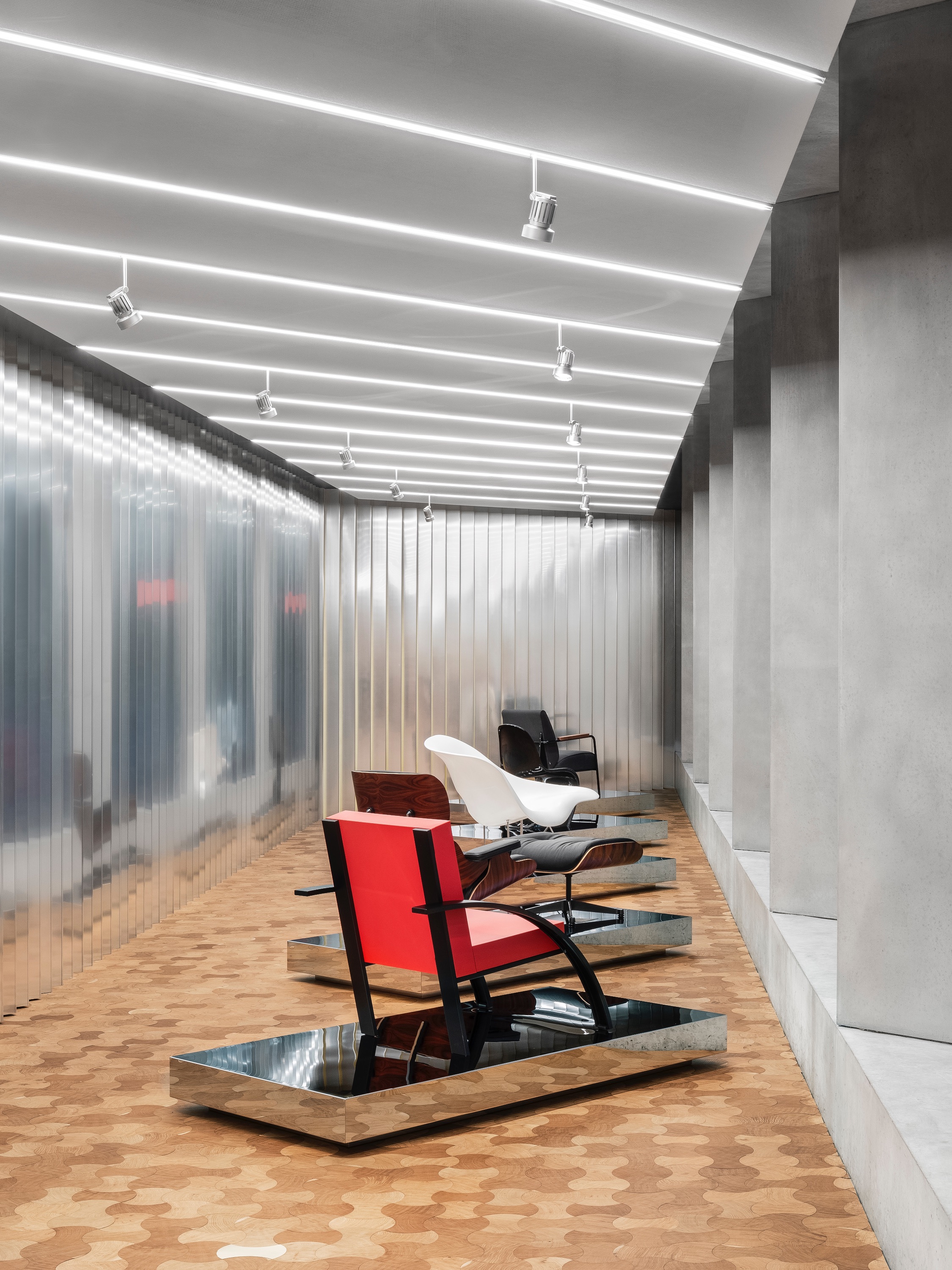 lo showroom si contraddistingue per la flessibilità, basata su un sistema appositamente progettato e sviluppato da UniFor insieme ad herzog & de meuron: una struttura di profili a estrusione e pannelli che possono essere configurati in molti modi. non ci sono stanze separate, ma spazi che possono essere riorganizzati in showroom più piccoli, aree per grandi eventi pubblici o sale per incontri più raccolti. metallo riflettente, colori vivaci, calore naturale del legno e solidità della pietra creano atmosfere diverse, ma coerenti, sfondo ideale per la presentazione dei prodotti UniFor.