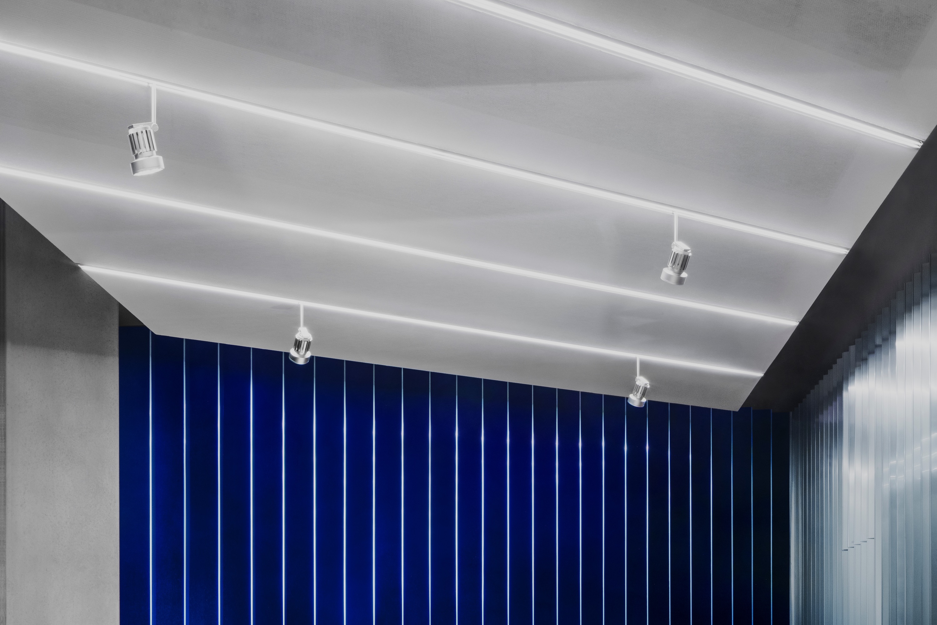 la massima flessibilità dello spazio si applica anche all’illuminazione: nella trama dei pannelli sul soffitto si integra perfettamente A1 sistema nella finitura argento hacca, che esalta la scelta cromatica degli arredi. questo binario ad altissima prestazione garantisce il massimo della qualità della luce riducendo al minimo i consumi di energia, proprietà fondamentale per un progetto che si colloca in un quartiere caratterizzato da una grande attenzione alla sostenibilità. sul binario sono applicati led lineari che forniscono un’illuminazione diffusa e faretti n55 con interfaccia orientabile, che permettono un’illuminazione più concentrata e diretta sull’esposizione, garantendo la massima resa del colore e della matericità degli elementi.