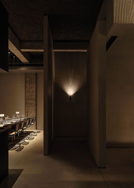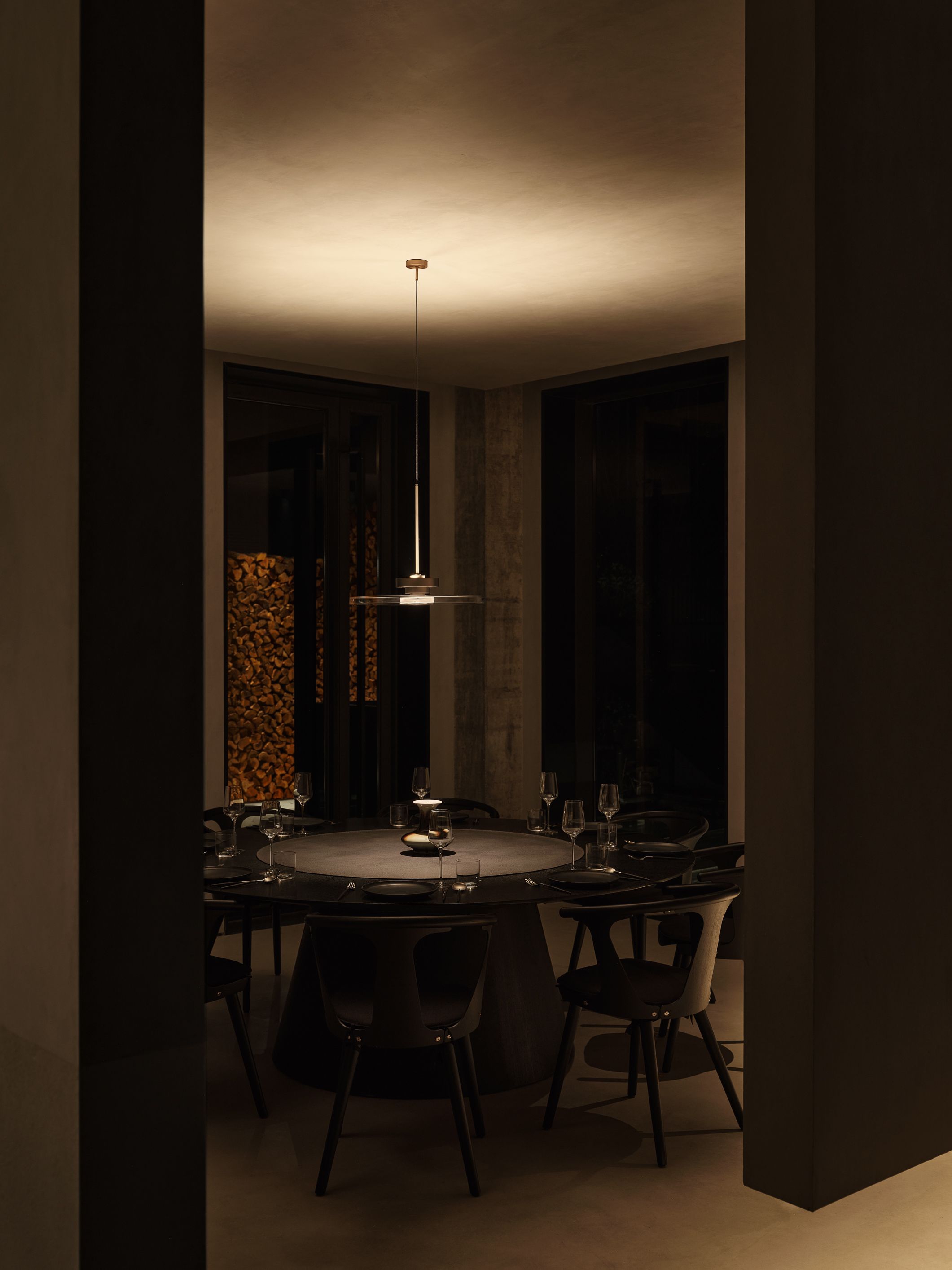 la luce è uno dei punti di forza di shy table, dove l'atmosfera suggestiva gioca un ruolo fondamentale per un'esperienza culinaria unica. sopra i tavoli più intimi, n55 sospensione con vetro decorativo nh02, disegnata dal rinomato studio cinese neri&hu, raccoglie i commensali intorno alla sua luce calda. brevi sezioni di microtraccia con faretto micromen e n22 disegnano segni di luce tra una zona e l'altra della sala.