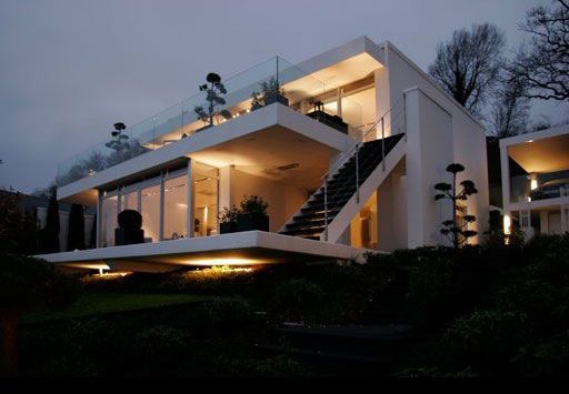 villa koed madsen è un omaggio alle ville moderne. la sua architettura è costruita da una geometria semplice: i setti murari che compongono la struttura sono linee orizzontali e verticali in cemento bianco che incorniciano grandi vetrate, mentre un corpo scala esterno collega il piano terra al primo piano. la casa è chiusa sul lato nord dove rare sono le finestre e si apre verso sud da dove si può godere della magnifica vista sul fiordo kolding, panorama visibile da ogni stanza. un piccolo annesso adiacente diviene riparo per le automobili. grazie alle ampie vetrate l'interno e l'esterno si integrano: di giorno l'interno gode della vista del mare e del panorama nordico, di notte è l'edificio con la sua illuminazione a divenire oggetto da ammirare.