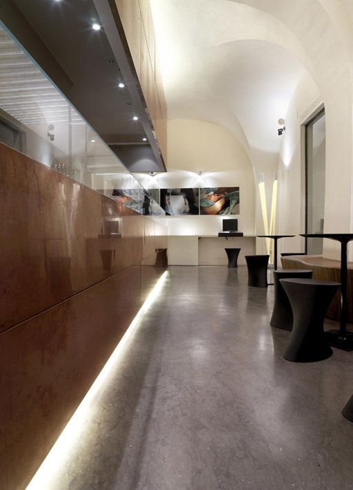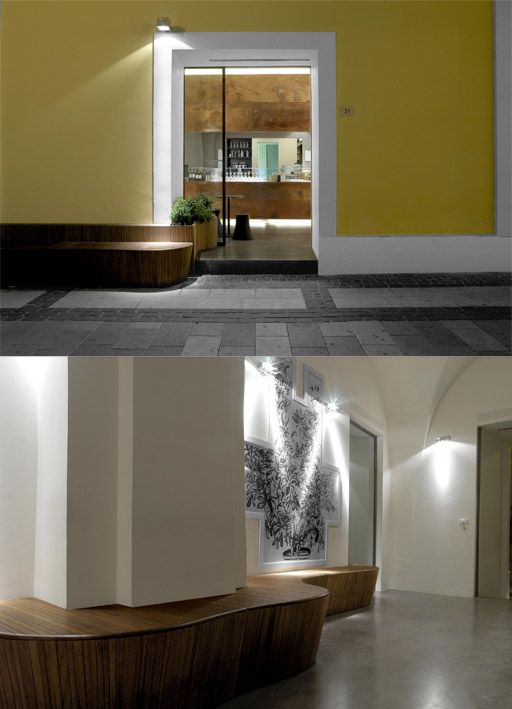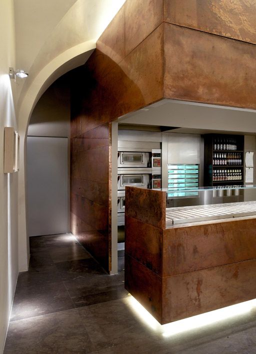 una pizzeria nel centro storico, un concept basato sulla ricerca di materiali di cottura e tradizione tradotti in chiave contemporanea come il rame/pentola (rame ossidato), il banco/tagliere (legno massello oliato), il pavimento/naturale (pietra cerata). spazio pensato come una 'piazza' dove un banco-chiosco, diventa protagonista nel consumo di gustose pizze margherita, pizze bianche e prodotti selezionati.una panca avvolge la struttura architettonica degli ingressi.luce per i colori naturali ispirati al bianco lievito e al bruno della pasta croccante, luce per fantasticare nell'attesa della pizza.