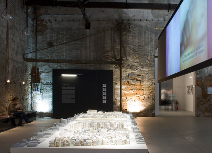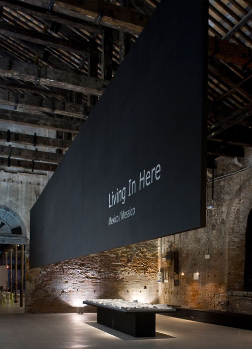 ‘living in here', una proposta collettiva per edilizia abitativa a città del messico che raccoglie le idee progettuali sia di diversi protagonisti coinvolti nell'edilizia sotto vari punti di vista sia degli estranei a questo campo. il gruppo jsª designdevelopment ha intervistato architetti, imprenditori edili, enti per l'edilizia popolare, professori, membri di associazioni architettoniche, leader delle comunità e residenti in progetti di edilizia abitativa sociale. questo studio ha fatto emergere che vi è intesa generale sul fatto che in messico l'edilizia è stata dimenticata sia dagli architetti che dallo stato e che per soddisfare la domanda si è lasciata carta bianca agli imprenditori edili che hanno creato progetti su larga scala completamente distaccati dal sociale e dalla città. nello spazio dell'arsenale sono stati invitati ad esporre dieci gruppi di giovani architetti per proporre idee per un'edilizia sociale all'interno della città (arturo ortiz struck + rozana montiel + tatiana bilbao sc + rojkind arquitectos / michel rojkind + productora / víctor jaime + abel perles + wonne ickx + carlos bedoya + arquitectura 911sc / jose castillo + saidee springall + tallerdearquitectura / mauricio rocha + frente / juan pablo maza + dellekamp arquitectos + gerardo asili / derek dellekamp + gerardo asili + at103 / francisco pardo + julio amezcua + peter ebner and friends). per ottenere questo risultato si è deciso di intervenire sul tessuto dei quartieri scegliendo la colonia obrera come terreno fertile di proposte, dal momento che questo quartiere è caratterizzato da una vita di strada molto intensa e da un commercio informale ed è un quartiere tipico del centro di città del messico. la questione è capire come coniugare una maggiore densità creando al tempo stesso spazi pubblici e servizi di edilizia popolare. i progettisti si sono presi la libertà di reinventarsi i codici costruttivi come meglio conveniva, tenendo a mente solo questioni di qualità di spazio e costruttibilità. è stato chiesto agli architetti di lavorare tutti insieme per creare uno spazio permeabile con i progetti interconnessi fra loro, in modo da trovare nuovi metodi di affrontare lo spazio e di rafforzare la comunità. lo scopo è di avere abbastanza densità per poter aprire una discussione sul come usare al meglio il nostro territorio e proporre una soluzione per espandersi. i progetti sono stati presentati con plastici e proiezioni e raccontati da pannelli grafici, il tutto accompagnato da luci puntuali che hanno enfatizzato la sobrietà del racconto urbano esposto. luci domestiche (E27) sospese sulle teste dei visitatori seduti li aiutavano nella lettura concentrata e intima, mentre i big feet posizionati radenti ai possenti muri in mattoni a faccia vista enfatizzavano la peculiarità del luogo. la luce dei c2 diventa narrativa e aiuta la comunicazione grafica dei pannelli, mentre la luce dei pro mini track scende dall'alto illuminando i plastici come fosse la luce naturale del sole, senza schiacciarne i volumi, ma enfatizzandone le ombre. l'attenzione posta dai progettisti anche per l'elemento luce è significativa per comprendere meglio la coscienza progettuale del team e i valori che questo spazio, rappresentativo del messico, voleva promuovere internazionalmente.